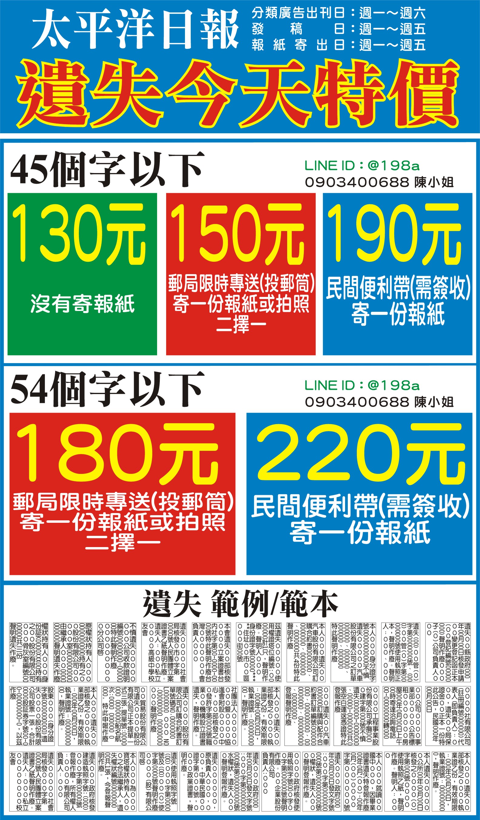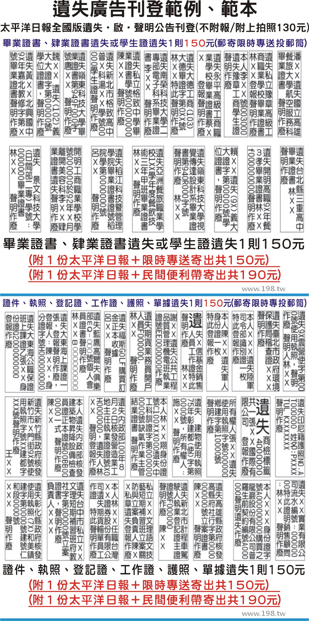 遺失廣告刊登範例、範本 太平洋日報全國版遺失•啟•聲明公告刊登(不附報/附上拍照130元)