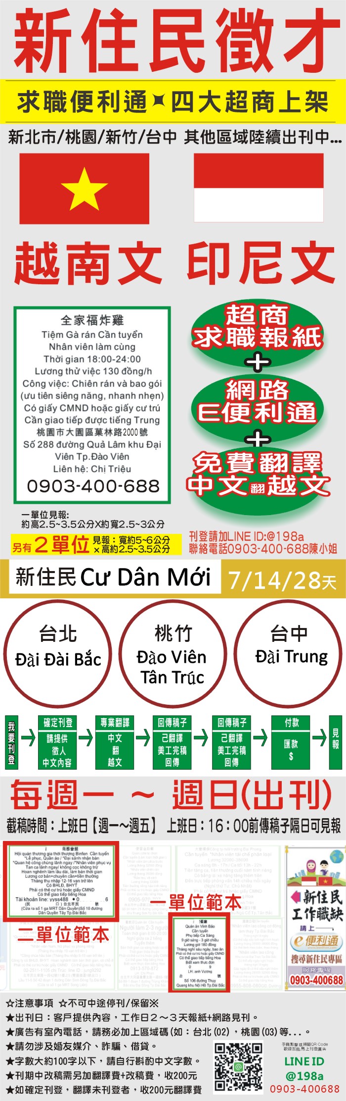 求職便利通 臺灣新住民 台北市 新北市 桃園 新竹 台中 徵才求職求才 越南文、印尼文(人事廣告/徵才廣告/求才廣告/報紙廣告)