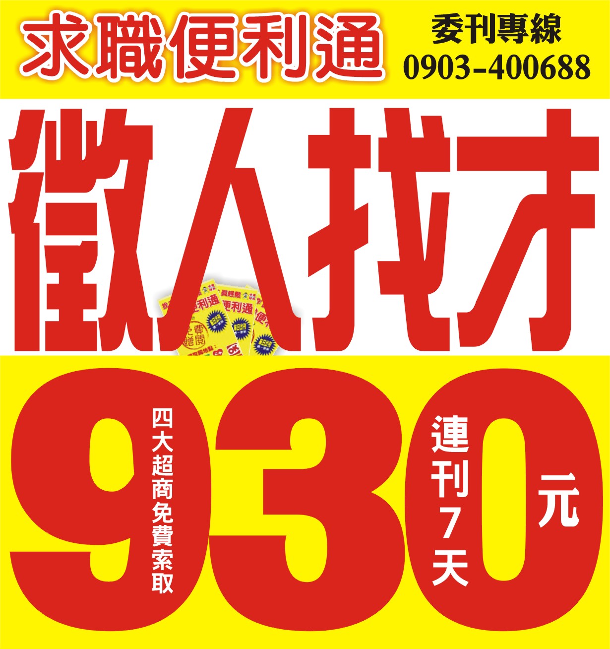 求職便利通7天930元起-徵人徵才找人-報紙刊登廣告+網路-台北市+新北市