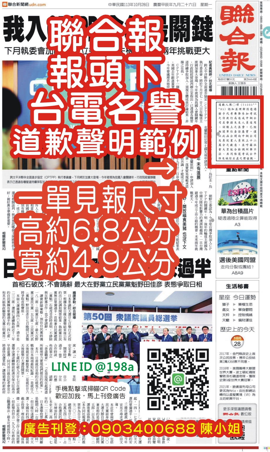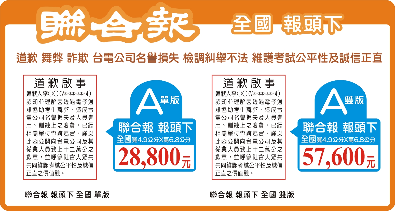 台電名譽 聲明啟事 舞弊 道歉啟事 聯合報 報頭下 全國版